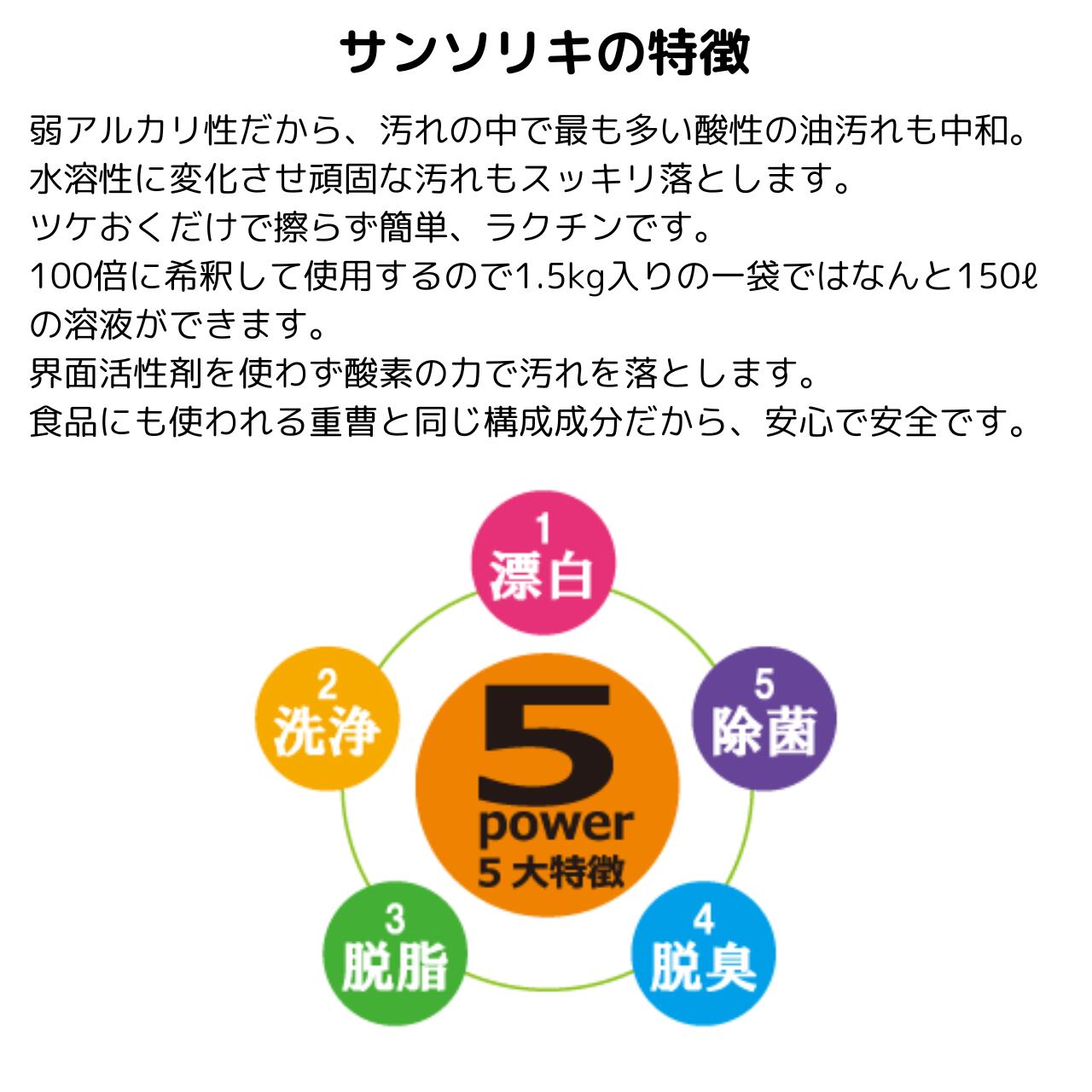 サンソリキの主原料は『過炭酸ソーダ』で、構成成分は自然界に存在するミネラルであり、食品に使われる重曹と同じです。なので手肌に優しく環境にも優しく、さらに粉末で同じ構成の重曹よりもさらに溶けやすくしているため、電気代や水道代の節約にもなります。
